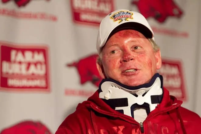 Arkansas fans are passionate about their pigs. This is a fanbase that unironically has made "Wooooooo, Pig! Sooie!" into a chant that they call out in support of their beloved Razorbacks. When it comes to their affinity for all things pig, Arkansas fans certainly go whole hog. What does this have to do with Bobby Petrino? Well, given his own experiences with hogs (albeit of the Harley Davidson variety), this is a man who should really, really know the dangers that they can bring. But since he's just eagerly climbed back into the saddle for his second stint as the head of Hog Nation (maybe/possibly/probably after orchestrating Sam Pittman's firing from behind the scenes), you have to conclude that he hasn't learned his lesson. And if that doesn't show pig-headedness, I don't know what does.