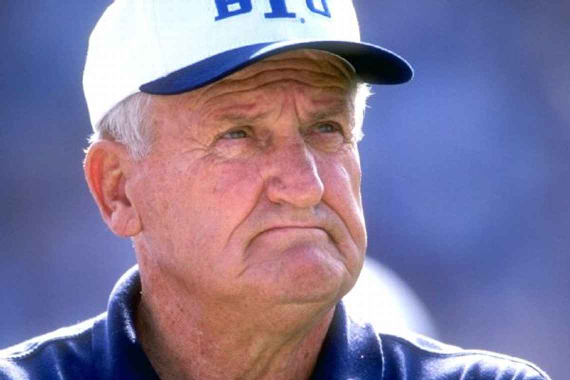 If you've ever seen photographs of Brigham Young, who succeeded Joseph Smith as the leader of the Church of Jesus Christ of Latter-Day Saints, you'll note that in almost all of them, he looks just incredibly dour. This was a man who had seen some seriously bad things. And probably done some seriously bad things, too, if historical accounts are to be believed. Today, the descendants of Brigham Young and those who took the 19th Century Mormon Trail with him make up the student body of the university that bears his name. LaVell Edwards was the head football coach at B.Y.U. for twenty-nine (!) seasons, from 1972 until his retirement in 2000. And just look at that face. He's seen some seriously bad things, too.