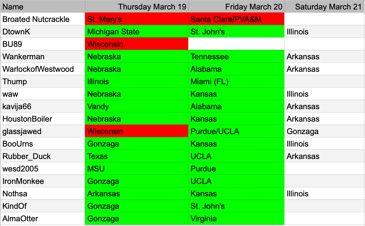 We've lost Broated and BU89. Sad drum and fife music. Glassjawed made his way back from his ill-fated Badger choice. The rest of us remain standing tall. Make your picks!