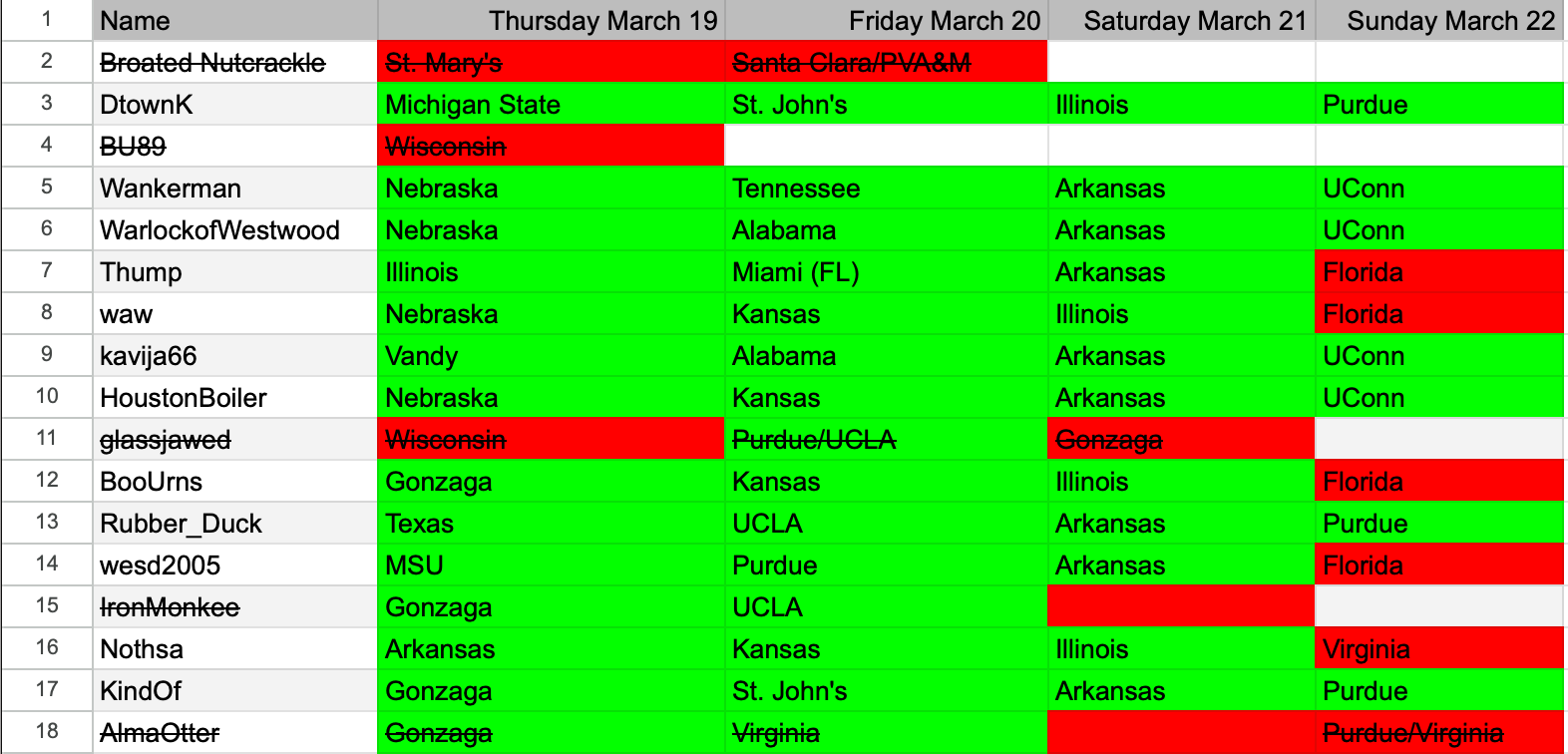Thump, was, BooUrns, and wesd2005 took the Gators and got Stirtzed. Nothsa and I put our hopes on Virginia, which was probably overly cavalier of us.