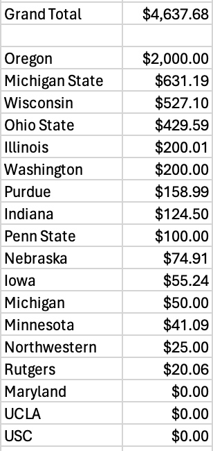 If you missed it a few days ago, we crossed a monumental milestone. We surpassed last year's Sherman Grants total! And there's still two weeks left until we close up the fundraising! Oregon remains in the very undisputed lead, with MSU and Wisconsin in tow. And we only have 3 missing fanbases to collect! While I would love to get 18/18, something does warm my heart about getting a few bucks from UCLA and Maryland to leave USC as the sole outlier.